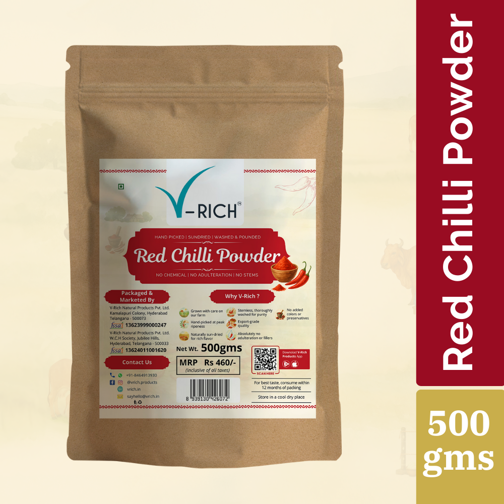 • Pure and Clean: Made using a traditional pounding method, we ensure that no chemicals, additives, or artificial flavors are added to the mix — only authentic Lal Mirch powder reaches you. At V-Rich, we use stemless, thoroughly washed chillies and turn them into powder with zero fillers or added colors.